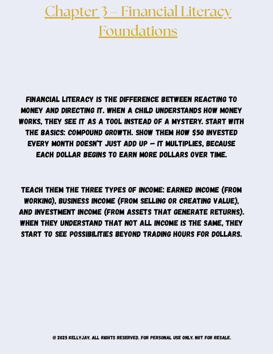 - Financial Foundations: Walk through Banking Basics, from setting up purpose-driven savings accounts to reviewing statements like a pro. Learn to teach the three types of income: Earned, Business, and Investment income.